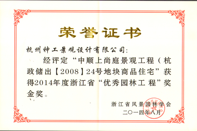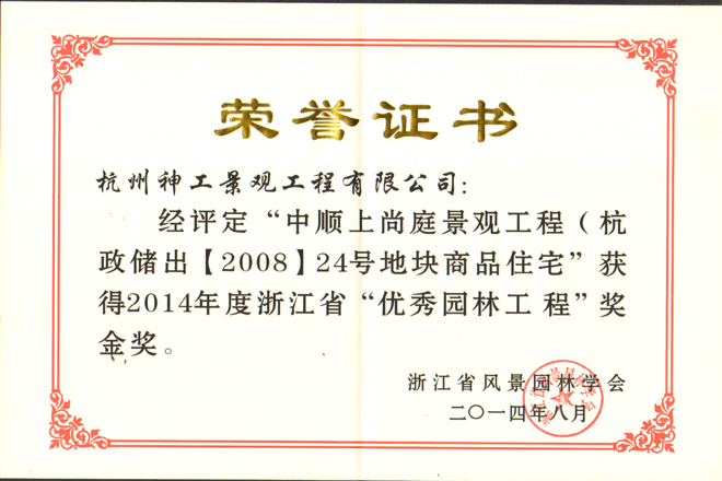 2014年“中顺上尚庭景观工程”荣获浙江省风景园林学会“优秀园林绿化工程”金奖