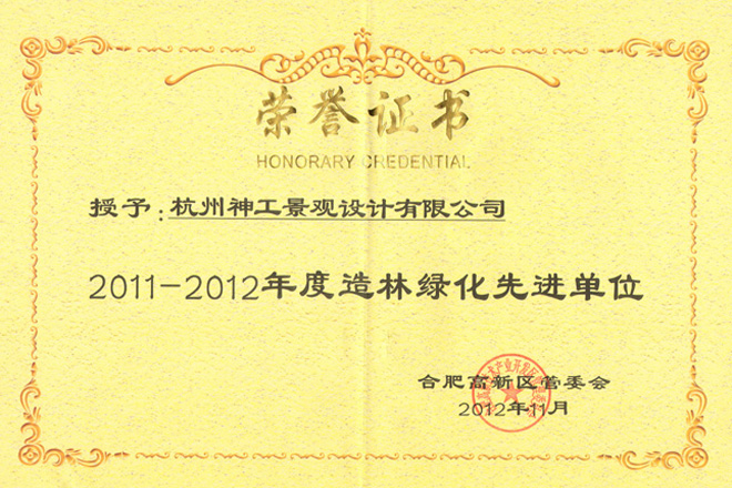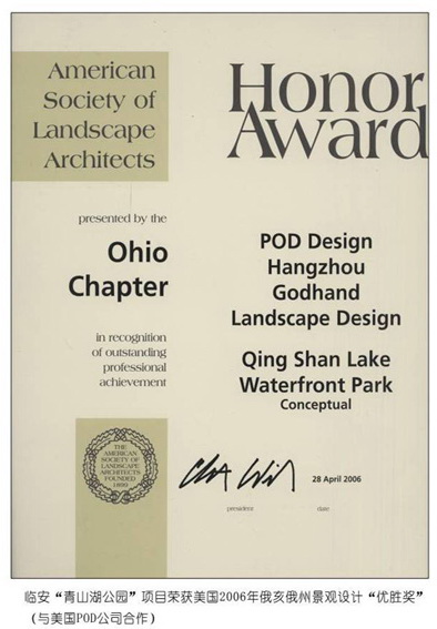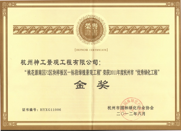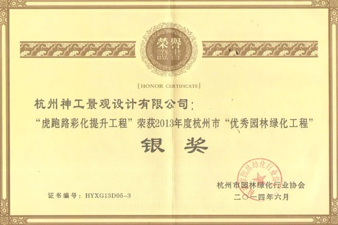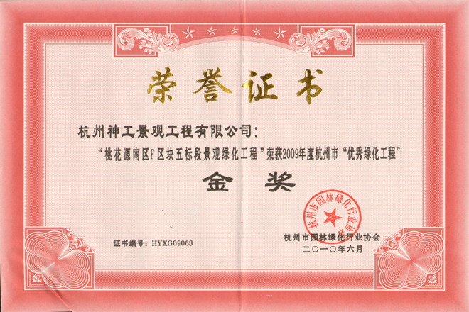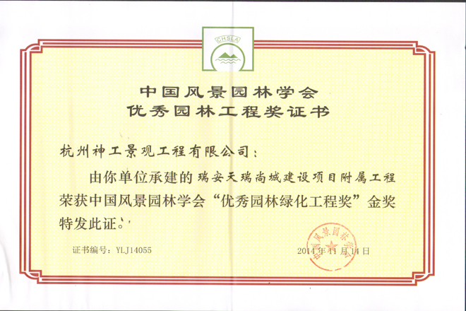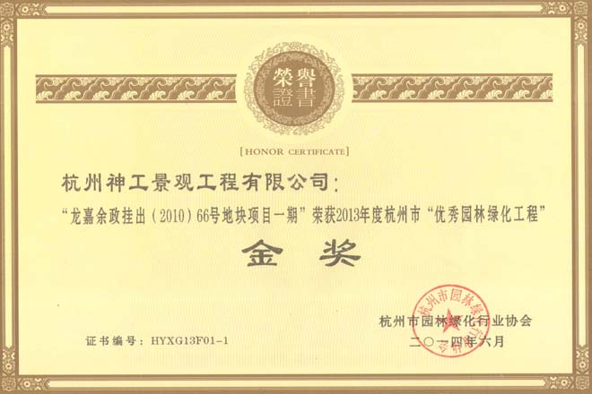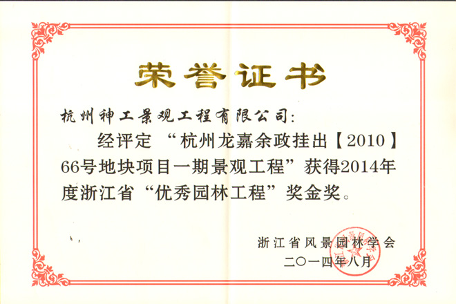 2014年"杭州龙嘉余政挂出【2010】66号地块项目一期景观工程";荣获浙江省风景园林学会"优秀园林绿化工程"金奖