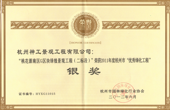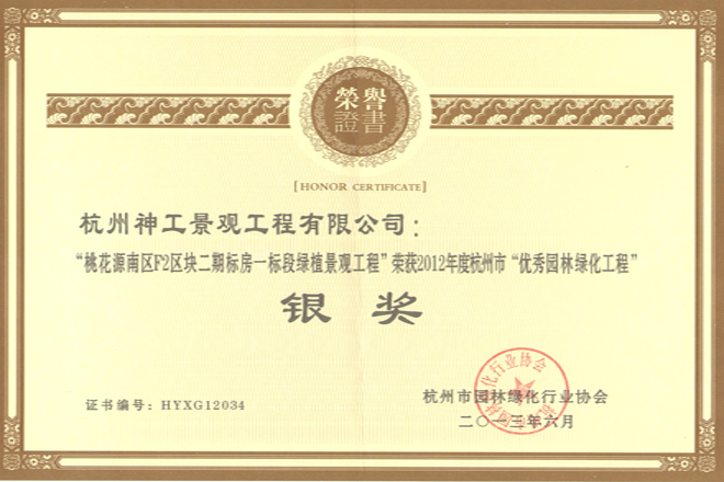 2012年度"桃花源南区F2区块二期标房一标段绿植景观工程"荣获杭州市"优秀园林绿化工程"银奖