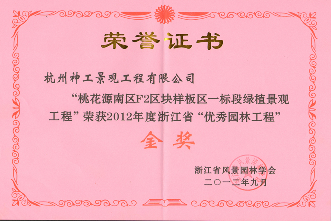 2013年度桃花源南区F2区块二期标房一标段绿植景观工程获浙江省"优秀园林工程"金奖