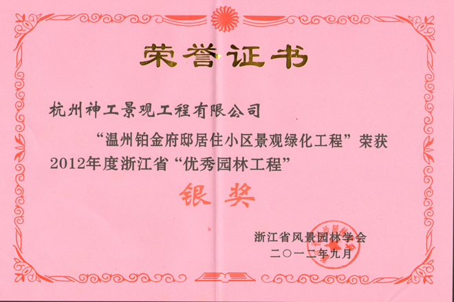2012年"温州铂金府邸"获省"优秀园林工程"银奖