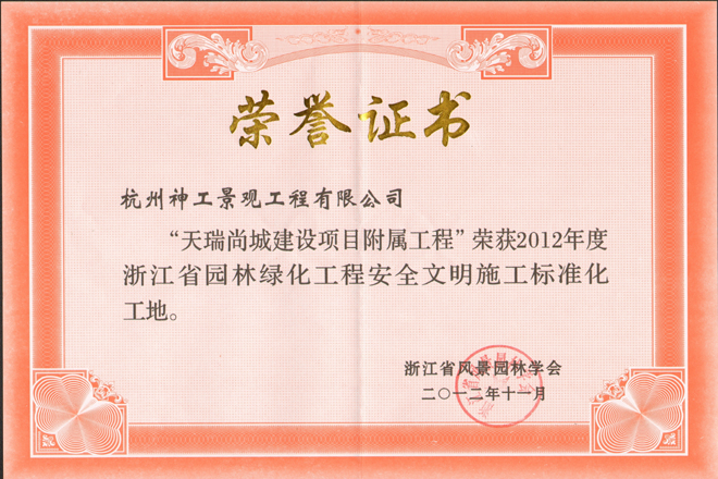 2012年"天瑞尚城建设" 获省园林绿化工程安全文明施工标准化工地