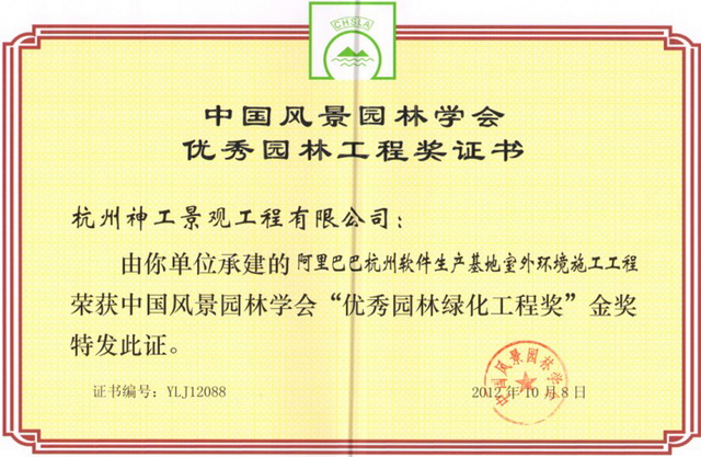 2012年"阿里巴巴杭州软件生产基地"获中国风景园林学会"优秀绿化工程"金奖