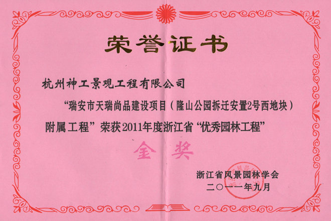 2011年"瑞安天瑞尚品"获省"优秀园林工程"金奖