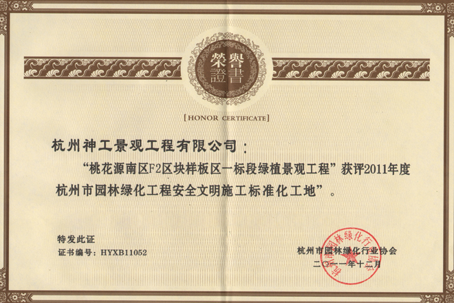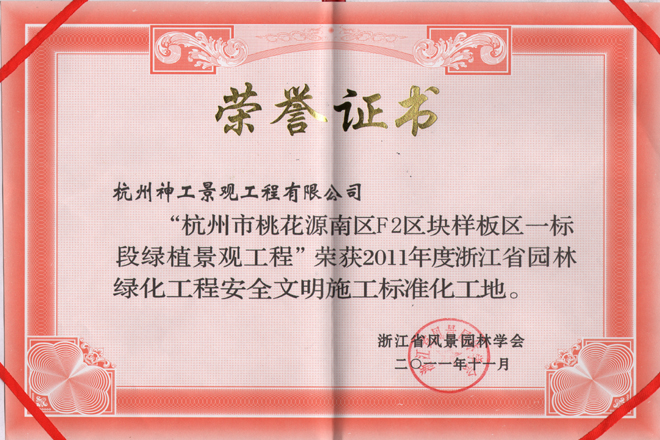 2011年"桃花源南区F2区块样板区一标段"获省园林绿化工程安全文明施工标准化工地