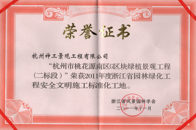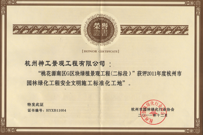 2011年"桃花源南区G区块二标段"获省园林绿化工程安全文明施工标准化工地