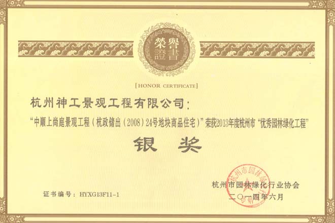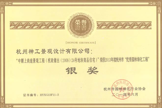2014年度"中顺上尚庭景观工程"荣获杭州市优秀园林绿化工程"银奖