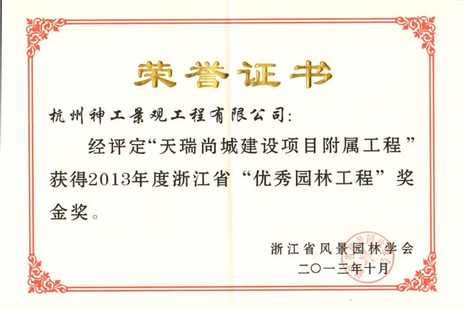 2013年度天瑞尚城建设项目附属工程获浙江省"优秀园林工程"金奖