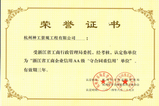 工程公司2014年被认定为"浙江省工商企业信用AA级'守合同重信用'单位"