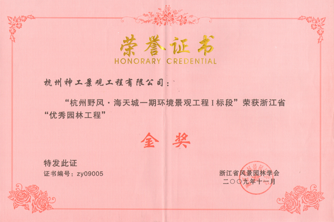 2009年"杭州野风海天城"获省"优秀园林工程"金奖