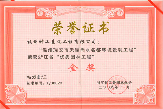 2008年"瑞安尚水名都"获省"优秀园林工程"金奖