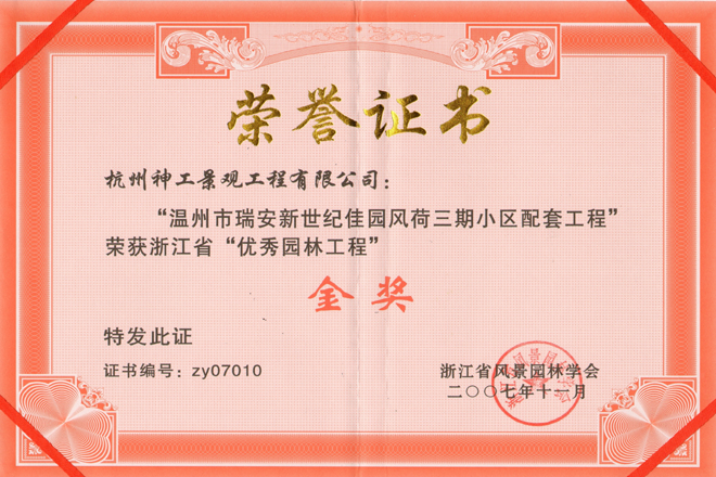2007年"瑞安新世纪佳园三期"获省"优秀园林工程"金奖